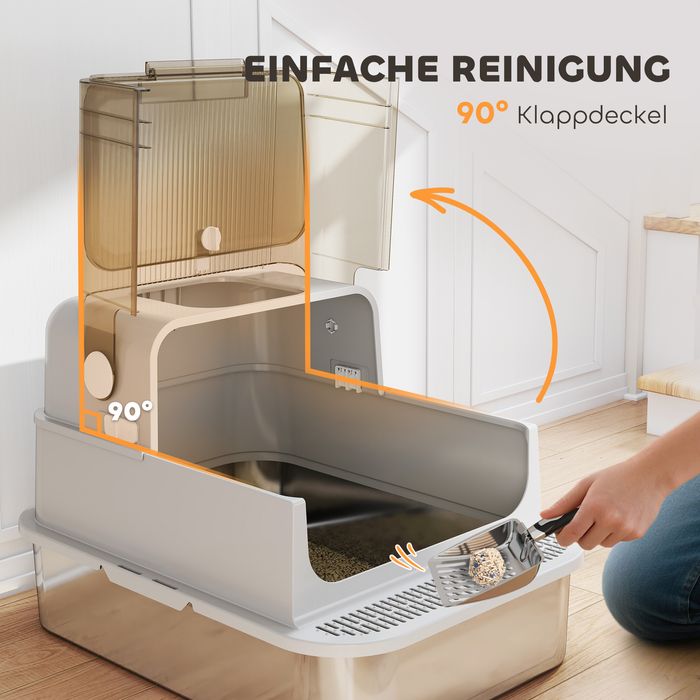 - Leichter sauber zu halten: Der vordere 90° Klappdeckel dieser Katzentoilette aus Edelstahl ermöglicht eine schnelle und einfache Reinigung. Das Filterpanel vorne fängt das Streu von den Pfoten der Katzen auf und mit der bereitgestellten Streuschaufel lässt sich Unordnung mühelos beseitigen