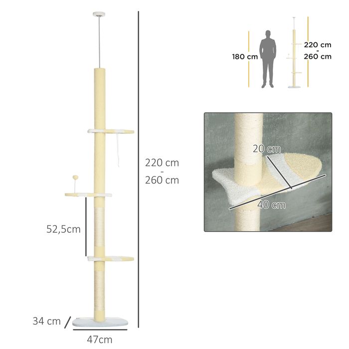 - Abmessungen des Kratzbaums: 47L x 34B x 220-260H cm. Für Katzen bis 5 kg geeignet. Montage erforderlich.