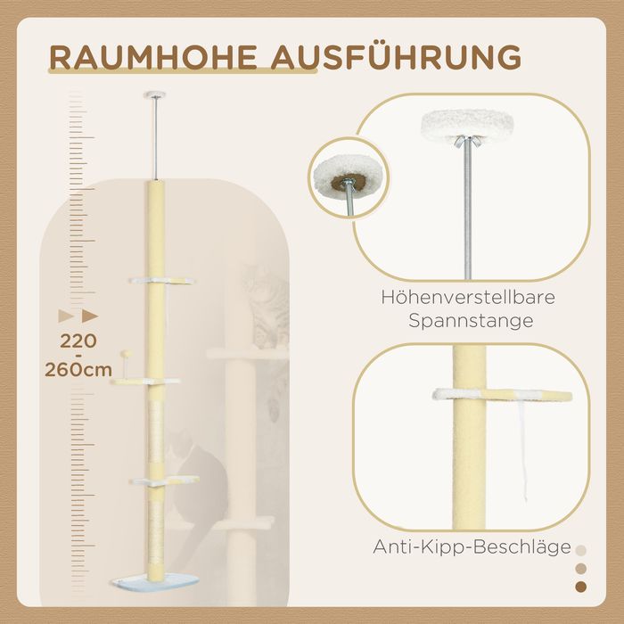 - Boden-bis-Decke: Ein eindrucksvoller Katzenbaum, der zwischen 220 und 260 cm variiert. Durch eine korrekt komprimierte Spannstange gewährleistet er Stabilität und Robustheit. Katzen können gefahrlos springen und klettern. Ausgestattet mit mehreren Ruheplätzen.
