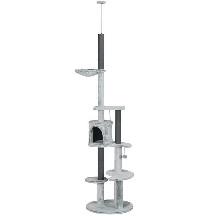 Kratzbaum Deckenhoch, 225-255 cm mit Katzenhöhle, Kratzstämmen, Korb, Spielball, Grau