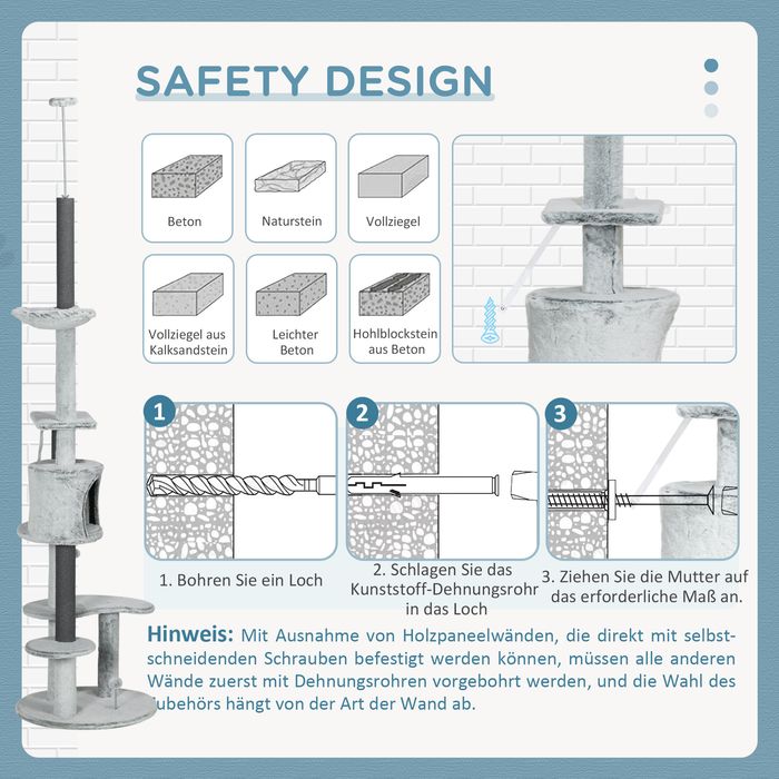 - Deckenhohes Kratzparadies: Dieser Kratzbaum erstreckt sich mit einer Höhe von 225-255 cm vom Boden bis zur Decke und bietet mehrere Ebenen zum Klettern, Springen und Spielen. Dank des Deckenspanners lässt sich der Baum fest und stabil fixieren, was eine sichere Umgebung für Ihre Katze schafft