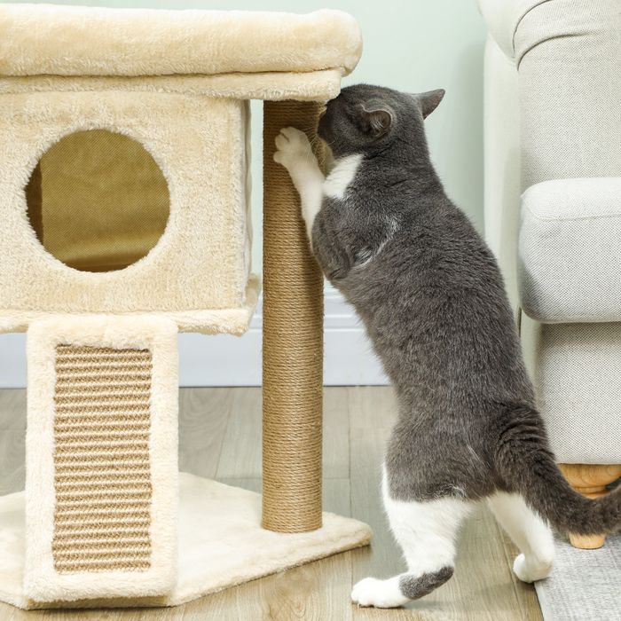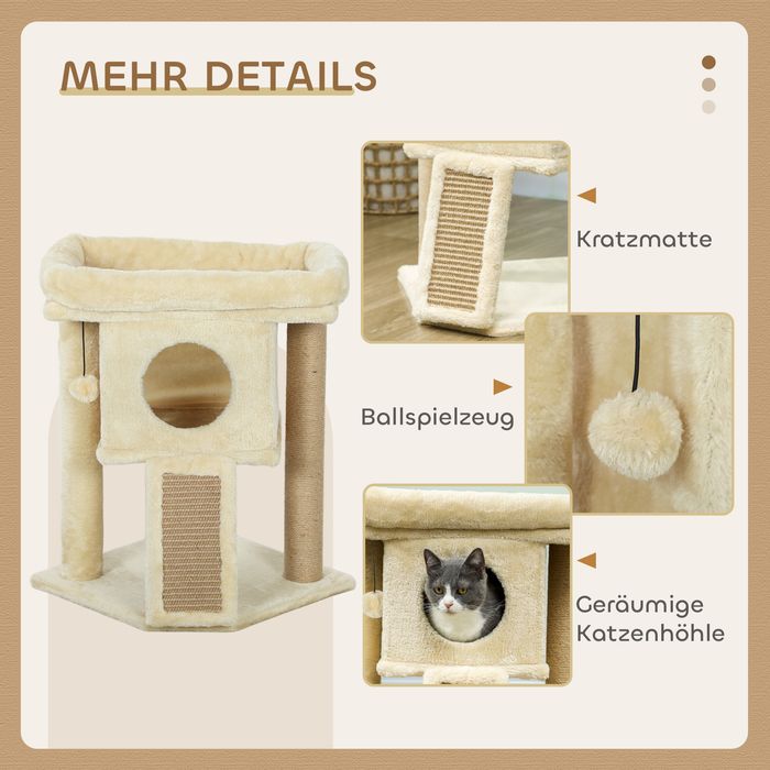 Dieses Katzenhaus von PawHut ist Kratzbaum, Spiel- und Schlafplatz in einem. Eine Kratzmatte aus Jute, ein Schlafplatz, ein Häuschen und ein Spielball sorgen für viel Abwechslung. Dank der drei Ebenen kann Ihr Stubentiger nach Herzenslust Klettern, Springen und Spielen. Und wenn sich ein Nickerchen anbahnt, dient die weiche Liegefläche auf dem Dach als hervorragendes Bett. Schenken Sie Ihrer Katze ein spannendes und kuscheliges neues Zuhause mit diesem vielseitigen Kratzbaum von PawHut.
