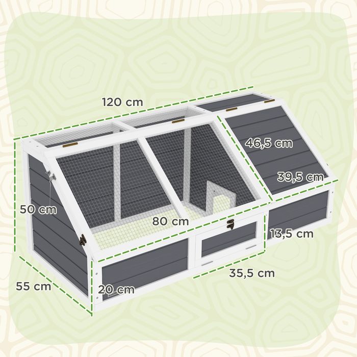 - Produktinformationen zum Schildkrötenhaus: Gesamtabmessungen: 120L x 55B x 20/50H cm (Vorder-/Rückseite). Geeignet für Schildkröten. Montage erforderlich