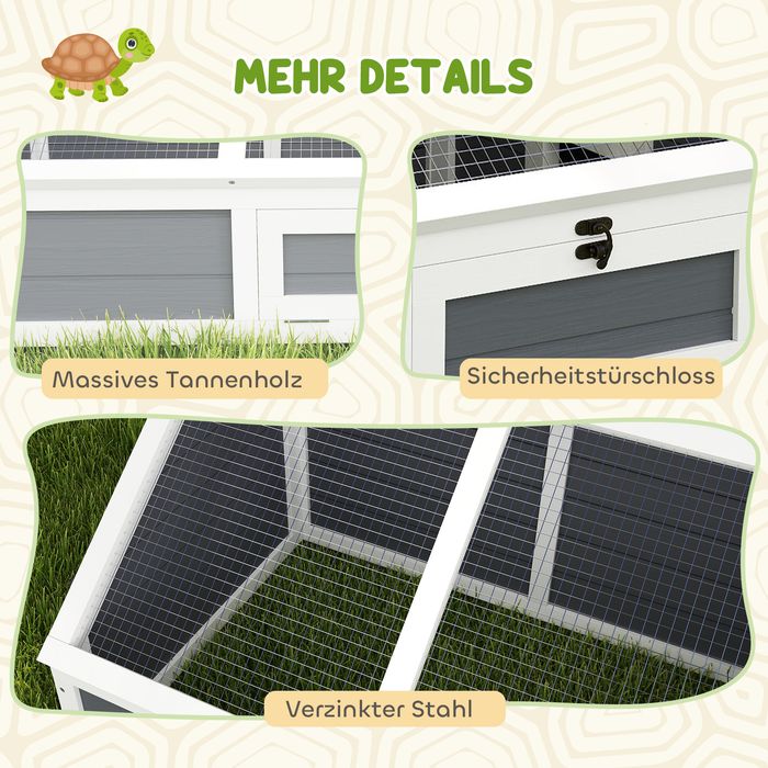 - Robuste Materialien: Gefertigt aus massivem Fichtenholz und verzinktem Stahl, sichert dieses Schildkrötenhaus einen dauerhaften und sicheren Lebensraum für Ihre Haustiere