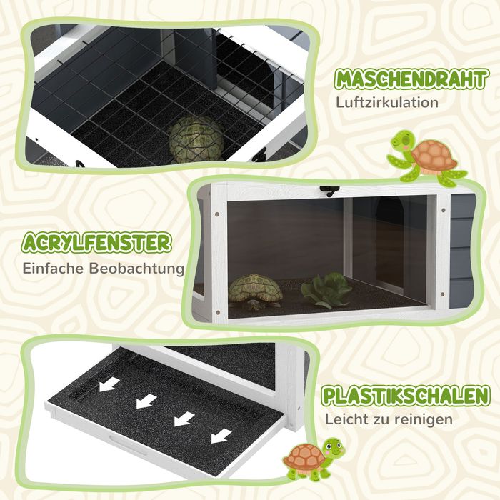 - Einfacher Zugang und Reinigung: Mit zwei ausziehbaren Schubladen und zu öffnenden Deckeln lässt sich dieses Schildkrötengehege problemlos warten. Die Deckel erleichtern auch das Hineingreifen und Versorgen Ihrer Haustiere