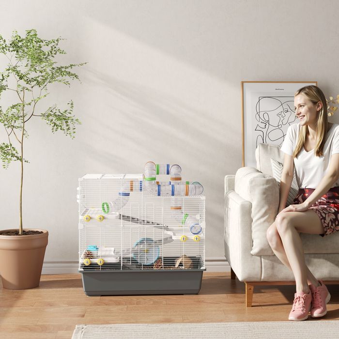 Entdecken Sie den PawHut Zwerghamsterkäfig! Der Kleintierkäfig bietet 4 Ebenen, ein buntes Röhrensystem zum Erkunden und reichlich Platz mit drei Stangen, Rampen und einer kuscheligen Hütte. Mit zwei Fronttüren und einer oberen Klappe leicht zugänglich, perfekter Hamster Käfig für kleine Nager, die die Abwechslung lieben.
