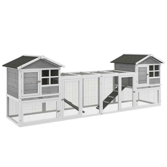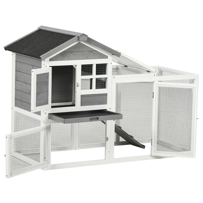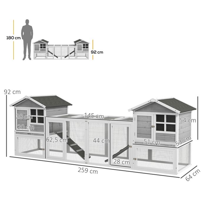 - Informationen zur Kaninchenhütte: Gesamtabmessungen: 259Lx64Bx92H cm. Abmessungen des Wohnhauses: 51Lx53Bx54H cm. Geeignet für 2-4 Kaninchen. Montage erforderlich.