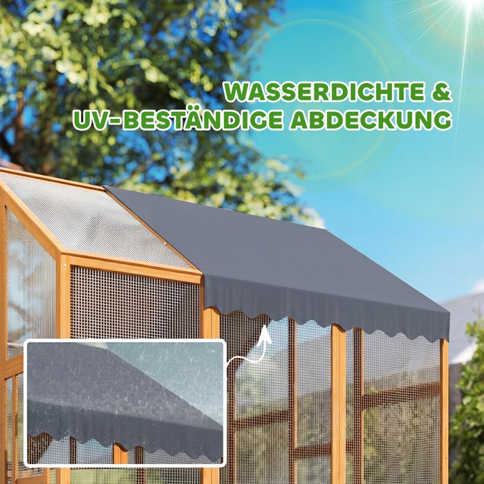 Verwandeln Sie Ihren Garten in ein Paradies für Geflügel mit dem Hühnergehege! Dieses geräumige, begehbare Hühnergehege bietet Ihren gefiederten Freunden ein sicheres Zuhause mit einem stabilen, feinmaschigen Gitter und einem grossen Lebensraum, der mit zwei Nistkästen und Sitzstangen ausgestattet ist. Die wasserdichte und UV-beständige Abdeckung sorgt dafür, dass sie das ganze Jahr über trocken und geschützt bleiben. Ein wunderbares Gehege für Ihre glücklichen Hühnerfreunde!